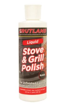 RUTLAND Liquid Stove & Grill Polish protects cast iron heating and cooking appliances from getting dull and rusty. Apply polish and buff to a high luster to restore that like-new appearance. Safe to use – non-flammable and non-toxic. One bottle should lightly polish an average sized, free standing wood stove or a large grill. Not for use on painted, sand-blasted, stainless, or raw steel surfaces.