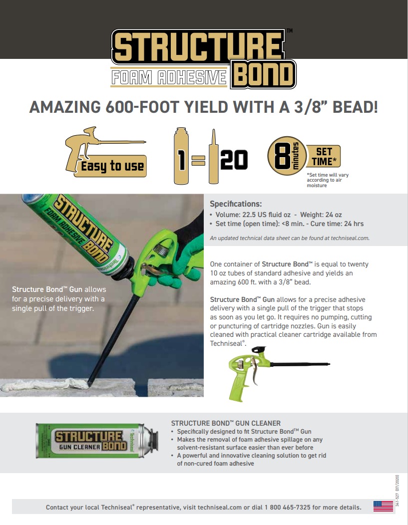 Structure Bond™ is an innovative super-strength foam adhesive that bonds a wide range of construction materials such as concrete, stone, brick, wood, metal, as well as composite materials. Made from high-quality modified polyurethanes, it’s adhesive strength is unmatched among all types of polyurethane adhesives. Application time is up to 50% faster than with conventional tube adhesives. Materials are bond in just 8 minutes, and the adhesive fully cures within 24 hours.